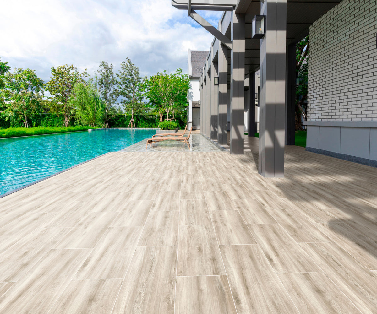 Paduc Oak heeft een warme houtlook in natuurlijke bruin- en zandtinten met subtiele nerftekening. Deze kleur zorgt voor een gezellige en uitnodigende sfeer en past uitstekend bij tuinen met een landelijke, Scandinavische of moderne stijl. De tegel combineert prachtig met houten schuttingen, groene beplanting, lichte accessoires en strakke tuinmeubelen. Ideaal voor het creëren van een terras met de uitstraling van echt hout, maar met het onderhoudsgemak van keramiek. De stijl is modern met een natuurlijke houtlook.