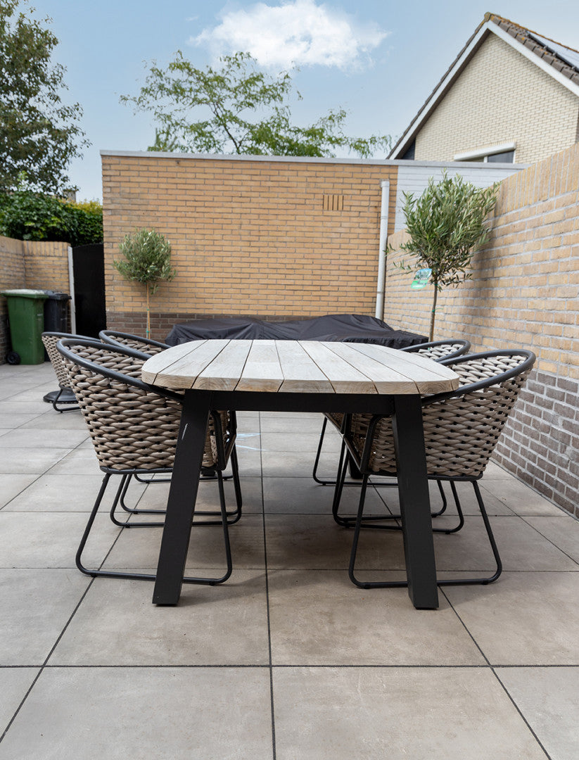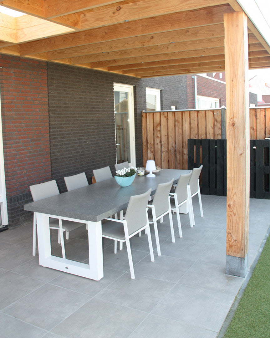 De tegel Knokke heeft een lichte, zachte grijstint met een subtiele betonlook. Deze kleur combineert perfect met houten details, groene beplanting en moderne tuinmeubelen in zowel lichte als donkere tinten. De tegel past uitstekend binnen moderne, Scandinavische en minimalistische tuinstijlen en creëert een frisse, rustige en tijdloze sfeer in de buitenruimte.