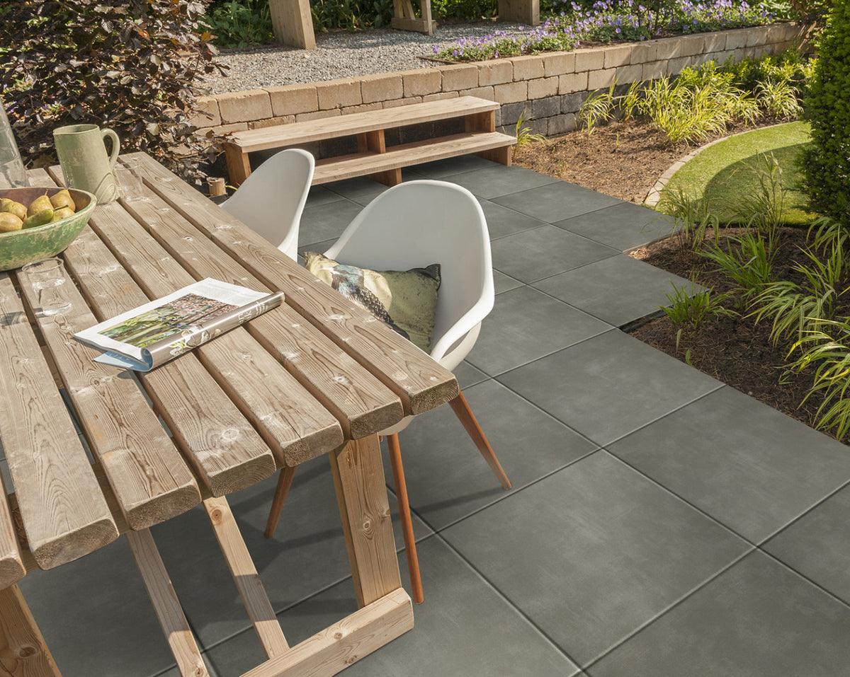 De tegel Leuven heeft een neutrale, middengrijze tint met een subtiele betonlook. Deze kleur combineert mooi met houten accenten, groene beplanting en modern tuinmeubilair in zwart, wit of aluminium. De tegel past uitstekend binnen moderne, industriële en minimalistische tuinstijlen en creëert een rustige, stijlvolle en tijdloze sfeer in de buitenruimte.