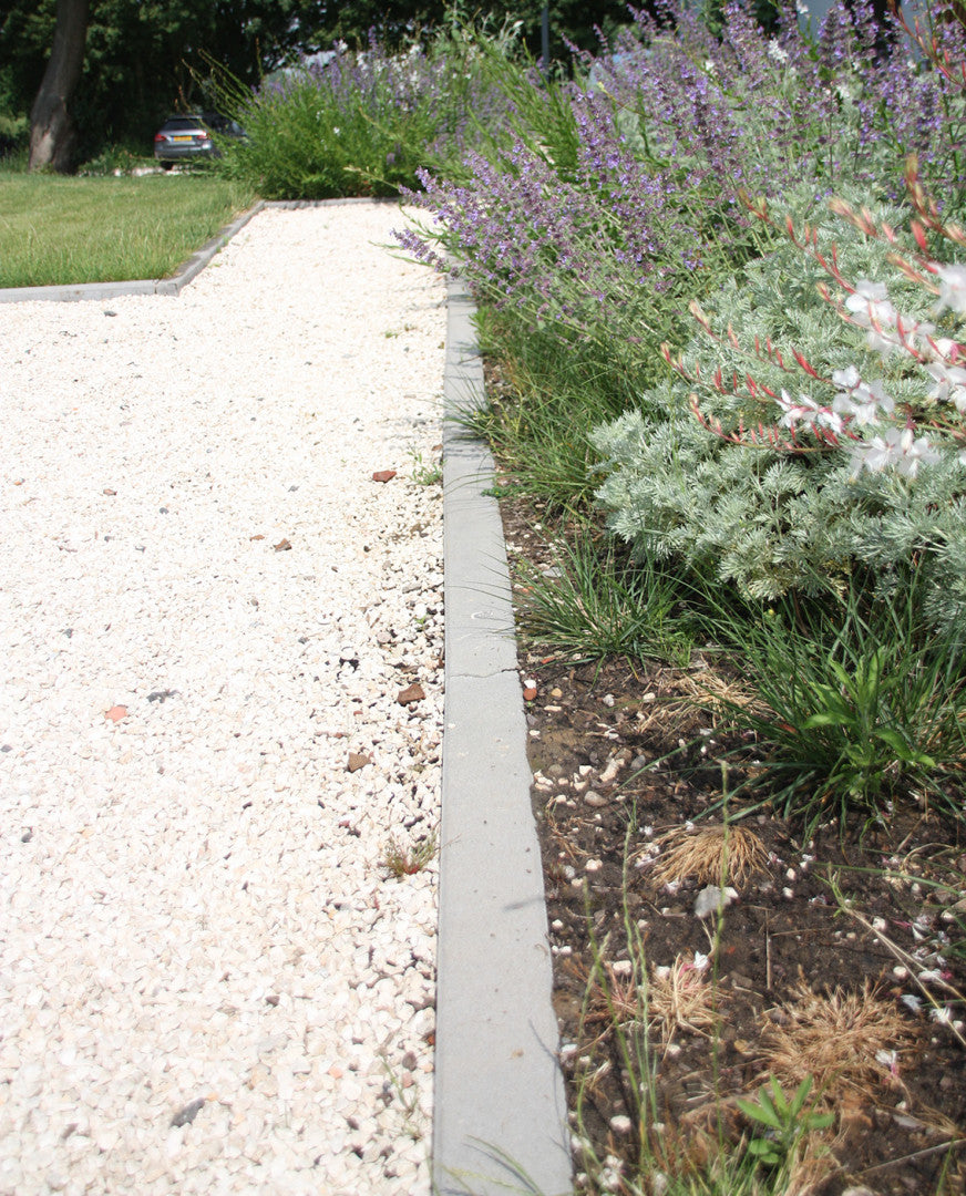 Deze opsluitbanden hebben een moderne grijze kleur die uitstekend past bij verschillende stijlen en kleuren van bestrating. Grijs is een neutrale en elegante tint die goed combineert met zowel warme als koele kleuren van tegels en stenen. Of je nu kiest voor een klassieke of een meer eigentijdse uitstraling, deze opsluitbanden brengen een strakke, professionele afwerking in je tuin.
