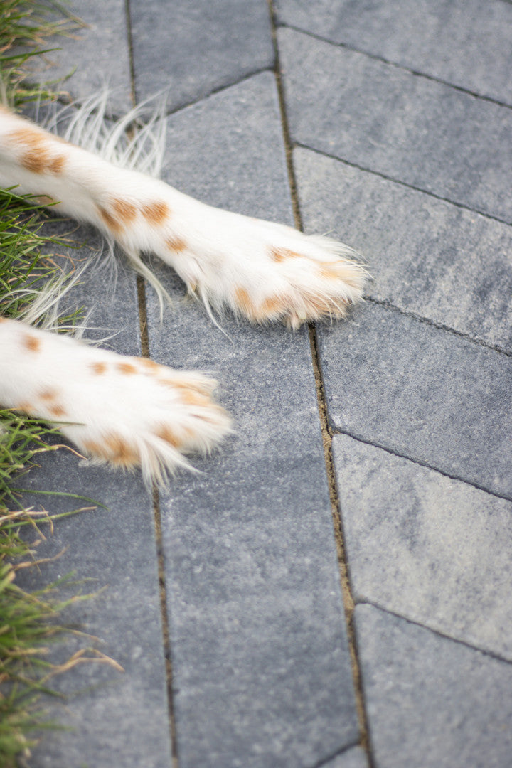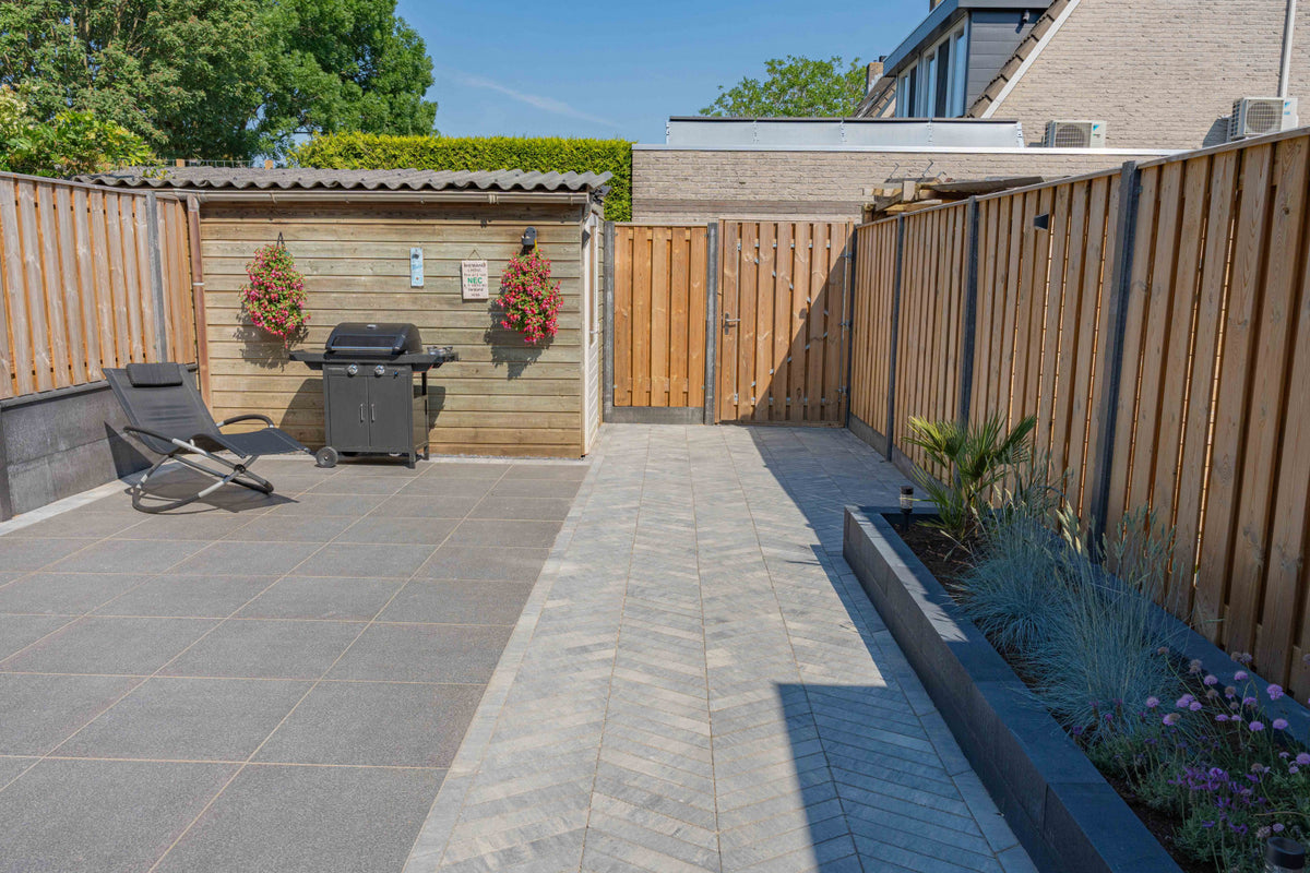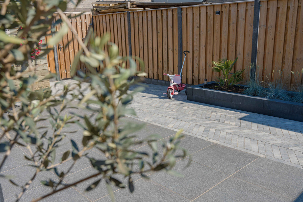 De kleur Grezzo kenmerkt zich door een natuurlijke grijstint met subtiele kleurnuances die goed combineren met hout, staal en groene beplanting. Deze steen past perfect binnen een moderne, industriële of strak aangelegde tuin. Dankzij het langwerpige formaat is het mogelijk om diverse legpatronen toe te passen, waarmee zowel een speels als een strak effect gecreëerd kan worden op paden, terrassen en opritten.