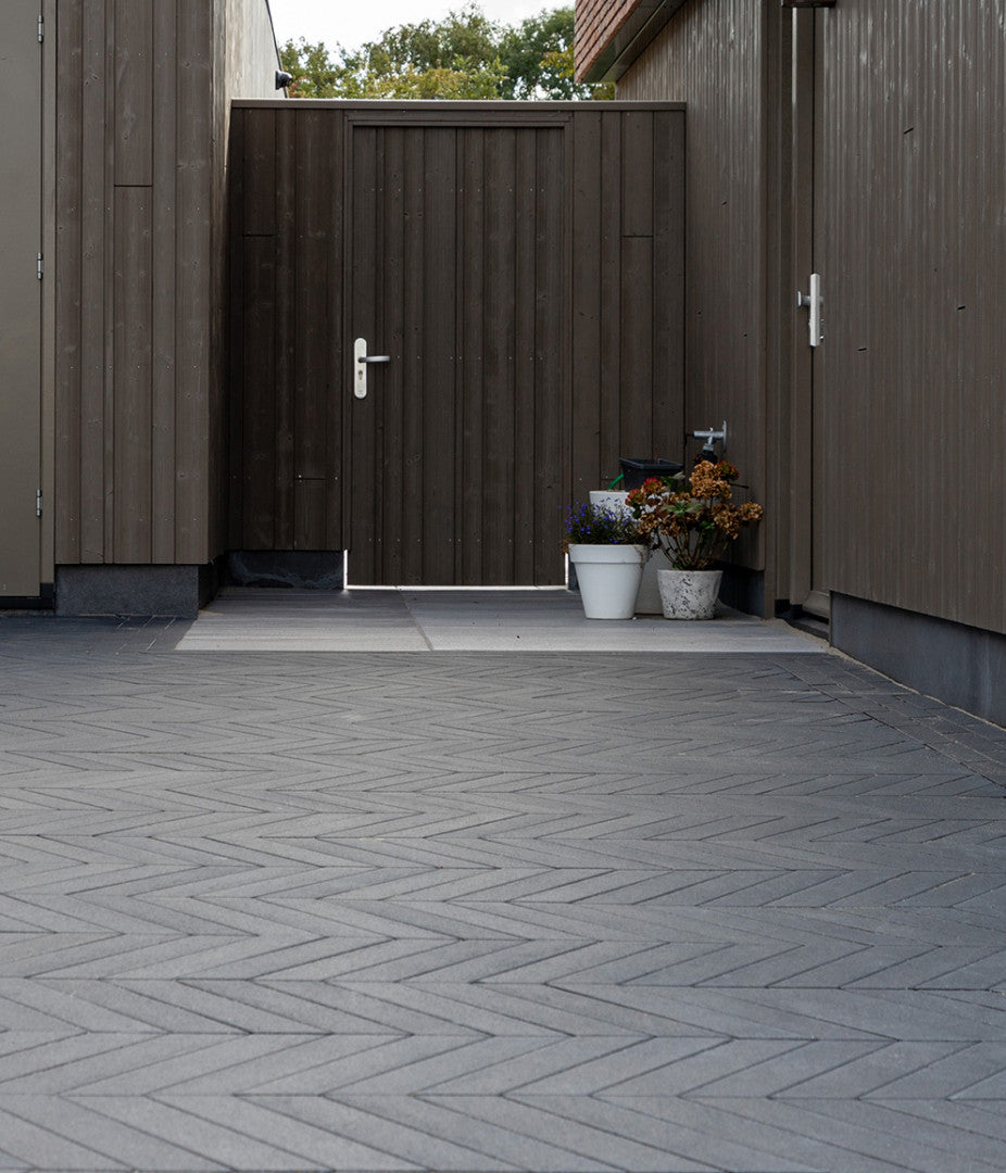 De kleur Nero heeft een diepe, donkere uitstraling met subtiele tintvariaties die zorgen voor een luxe betonlook. Deze steen sluit perfect aan bij moderne, industriële en strakke tuinen. In combinatie met stapelblokken, houten accenten of groene beplanting ontstaat een stijlvol contrast dat zorgt voor een eigentijdse en krachtige sfeer in de buitenruimte.