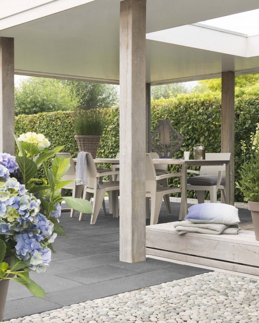 De kleur Nero is een diepe, donkere antraciettint die zorgt voor een krachtige en eigentijdse uitstraling. Deze kleur laat zich mooi combineren met groene beplanting, lichte borders en houten of metalen tuinelementen. De tegel past perfect binnen moderne, minimalistische en industriële tuinstijlen en creëert een luxe, rustige en stijlvolle sfeer in de buitenruimte.