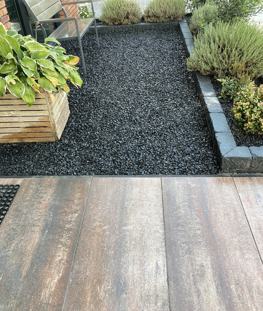 De kleur Violetto is een diepe, donkere antraciettint die zorgt voor een krachtige en eigentijdse uitstraling. Deze kleur laat zich mooi combineren met groene beplanting, lichte borders en houten of metalen tuinelementen. De tegel past perfect binnen moderne, minimalistische en industriële tuinstijlen en creëert een luxe, rustige en stijlvolle sfeer in de buitenruimte.