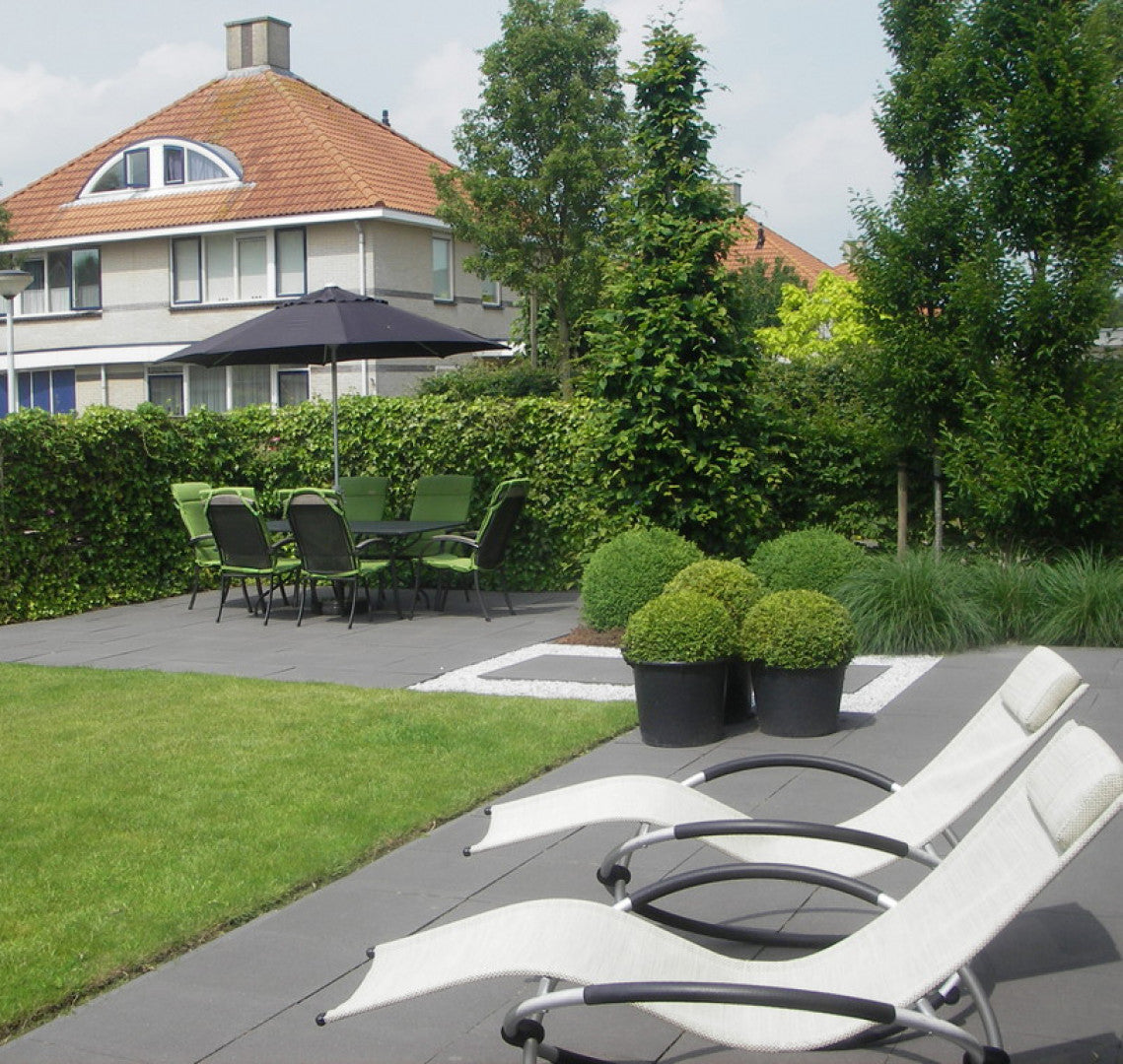 De diepe nero tint geeft de bestrating een luxe en moderne uitstraling. Deze kleur sluit perfect aan bij een minimalistische, industriële of moderne tuinstijl en combineert fraai met hout, staal en weelderig groen. Het resultaat is een eigentijdse buitenruimte met een rustige en stijlvolle sfeer.