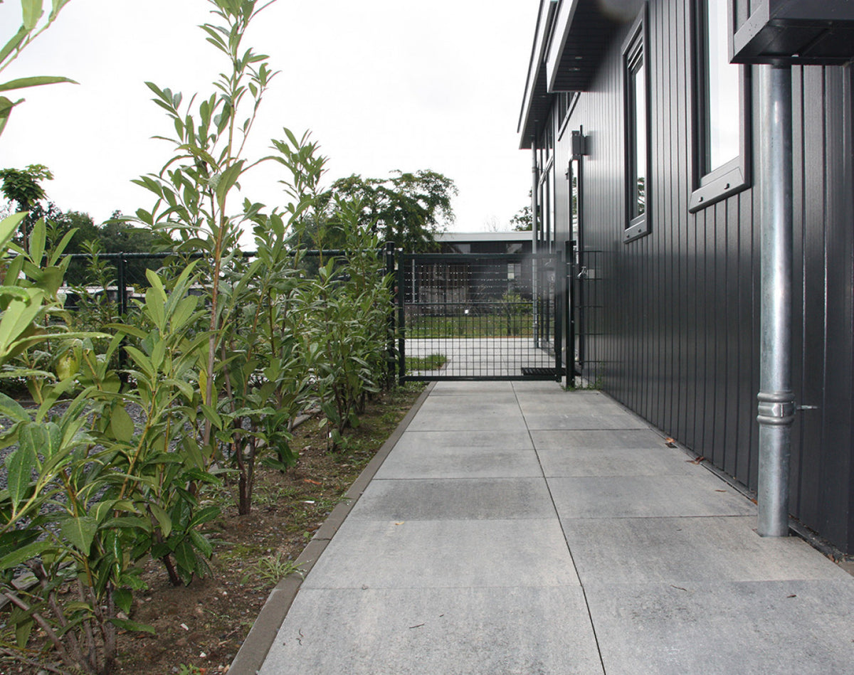 De kleur Grezzo heeft een warme, genuanceerde grijstint met een natuurlijke betonlook. Deze uitstraling past perfect binnen moderne, industriële en landelijke tuinstijlen. In combinatie met houten accenten, stapelblokken of groene beplanting ontstaat een sfeervol en rustig geheel. Ook als basis voor een moderne oprit of een strak terras zorgt de Grezzo tegel voor een tijdloze en luxe uitstraling.