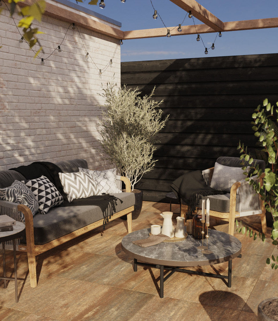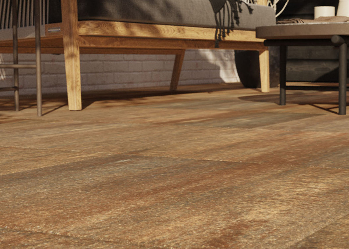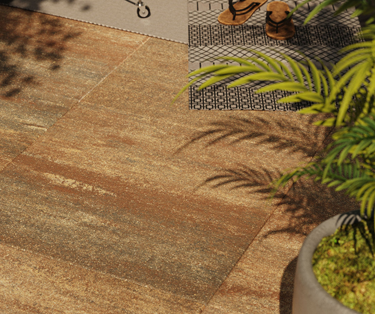 De kleur Omber bestaat uit warme roest- en aardetinten met subtiele donkere accenten. Dit geeft de tegel een karaktervolle en natuurlijke uitstraling. De tint past perfect in landelijke, mediterrane en industriële tuinstijlen en combineert mooi met hout, cortenstaal en weelderige beplanting. Het formaat van 60x60 cm versterkt de rustige basis en laat de kleurnuances goed tot hun recht komen.