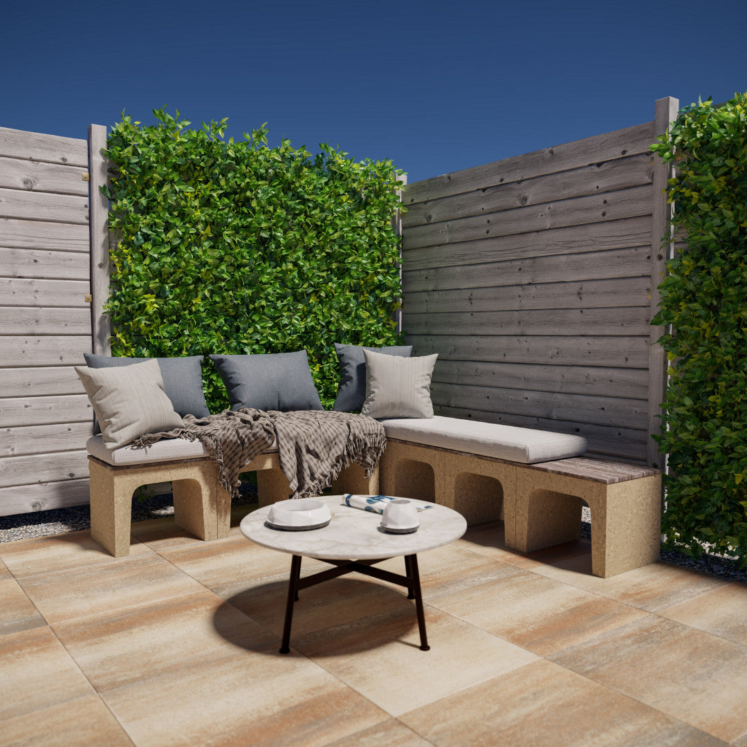 Het element is vervaardigd uit hoogwaardig beton, waardoor het jarenlang meegaat en weinig onderhoud vergt. De neutrale grijze kleur past moeiteloos in diverse tuinontwerpen en laat zich eenvoudig combineren met andere bestrating of stapelmaterialen.